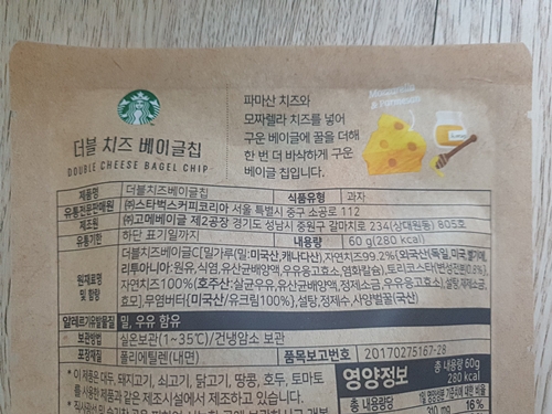 베이글칩의 특성상 칼로리가 꽤 높은 편이긴 해요. 60g인데 280kcal이니까요.