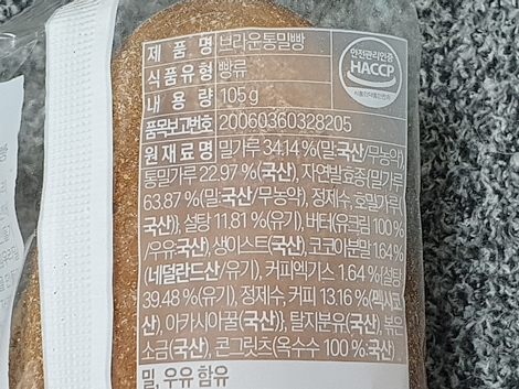 100퍼센트 통밀은 아니고요. 일반 밀가루도 사용했습니다. 통밀가루가 22.97%, 밀가루가 34.14%입니다. 100퍼센트 통밀은 아니라 아쉽지만 그래서 부드러운 맛이 좋은 빵입니다. 커피 진액, 코코아 분말도 들어갔는데요. 향이 강하지 않아서 들어가 있는 줄 모를 정도예요. 하지만 만약 카페인에 민감하시면 피하셔야 할 거 같네요.