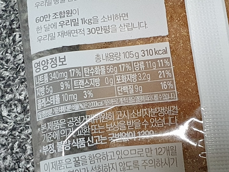 우리밀을 사용한 제품으로 한살림에는 우리밀을 사용해서 빵을 만들기 때문에 환경적이기도 합니다. 한살림 우리밀 브라운 통밀빵은 칼로리가 310kcal로 생각보다 꽤 높은 칼로리를 가지고 있습니다.