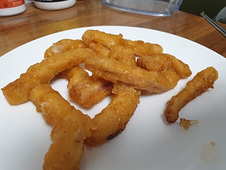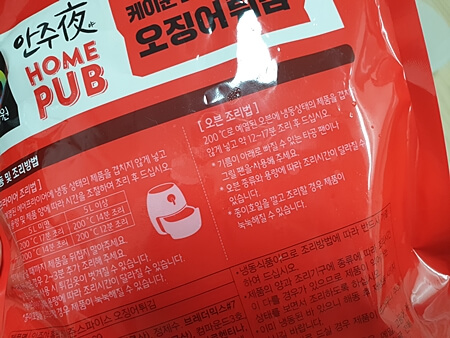 에어프라이어가 찐득해지는 게 싫어서 저는 늘 종이 포일을 사용하는데, 역시 조리방법에 나와있는 데로 기름이 밑에 고이면서 튀김옷이 눅눅해져서 벗겨지기도 하더라고요. 웬만하면 종이 포일 깔지 않고 기름이 아래로 빠지도록 해야 골고루 바삭하게 구워지는 것 같습니다. 몇 개는 기름이 쫙 빠져서 바삭하게 잘 구워져서 훨씬 맛있었습니다. 약간 짭짤한 간으로 맥주나 음료랑 먹는 게 좋습니다. 안주가 아니어도 밥반찬으로 괜찮을듯합니다. 페루산 대왕 오징어라 씹는 맛이 있고 도톰합니다.