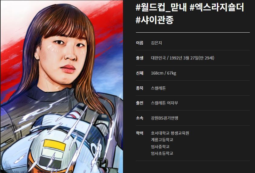 2021 코리아컵 3차 대회 스켈레톤 3위, 2차 대회 1위, 2020 북아메리카컵 8차 3위, 7차 2위, 6차 3위 등 각종 수상경력에 빛나는 국가대표 여자 봅슬레이 선수 김은지는 봅슬레이 팀의 믿음직스러운 선수입니다. 올림픽 첫 출전이며 멀리뛰기 선수 경력이 있습니다.